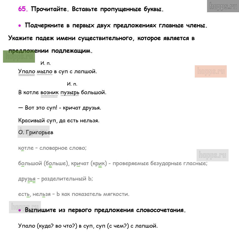 Готовые ответы к 65 упражнению 2 части рабочей тетради по русскому языку для учащихся 3 класса, автора В.П. Канакина, Школа России, 2019 г.