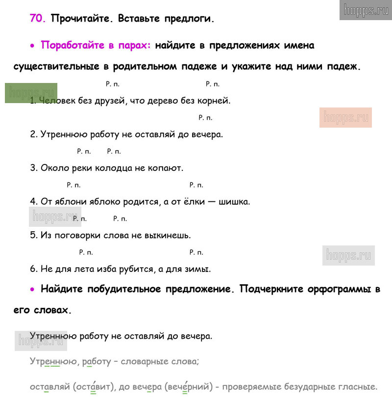Готовые ответы к 70 упражнению 2 части рабочей тетради по русскому языку для учащихся 3 класса, автора В.П. Канакина, Школа России, 2019 г.