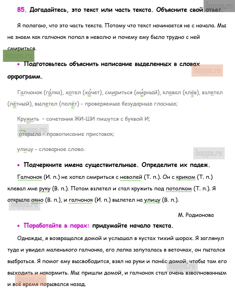 Готовые ответы к 85 упражнению 2 части рабочей тетради по русскому языку для учащихся 3 класса, автора В.П. Канакина, Школа России, 2019 г.
