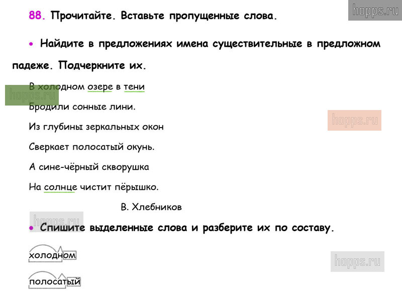 Готовые ответы к 88 упражнению 2 части рабочей тетради по русскому языку для учащихся 3 класса, автора В.П. Канакина, Школа России, 2019 г.