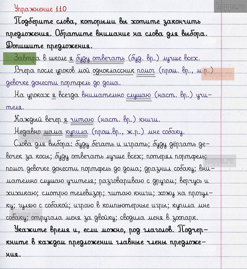 Готовые ответы к 110 упражнению 2 части рабочей тетради по русскому языку для учащихся 3 класса, авторов Л.Ф. Климанова, Т.В. Бабушкина, Перспектива, 2021 г.