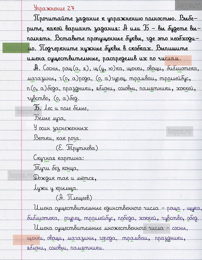 Готовые ответы к 27 упражнению 2 части рабочей тетради по русскому языку для учащихся 3 класса, авторов Л.Ф. Климанова, Т.В. Бабушкина, Перспектива, 2021 г.