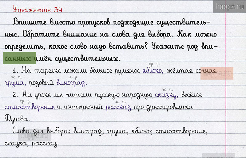 Готовые ответы к 34 упражнению 2 части рабочей тетради по русскому языку для учащихся 3 класса, авторов Л.Ф. Климанова, Т.В. Бабушкина, Перспектива, 2021 г.