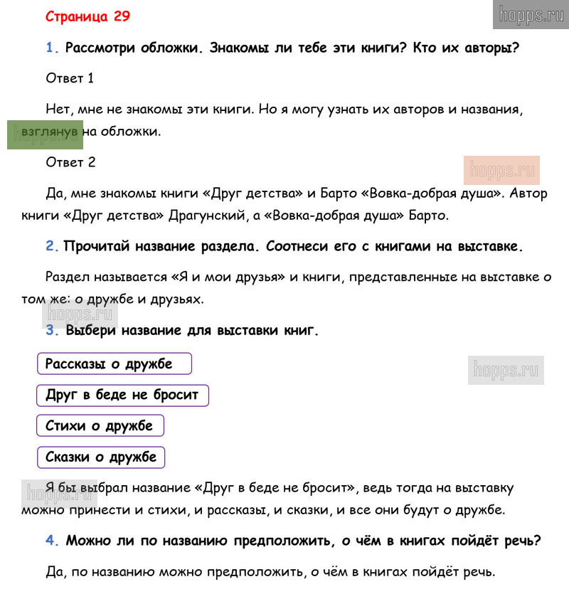 Готовые ответы к вопросам и заданиям на 29 странице 2 части учебнику по литературному чтению для учащихся 1 класса, авторов Л.Ф. Климанова, В.Г. Горецкий, М.В. Голованова, Школа России, 2019 г.