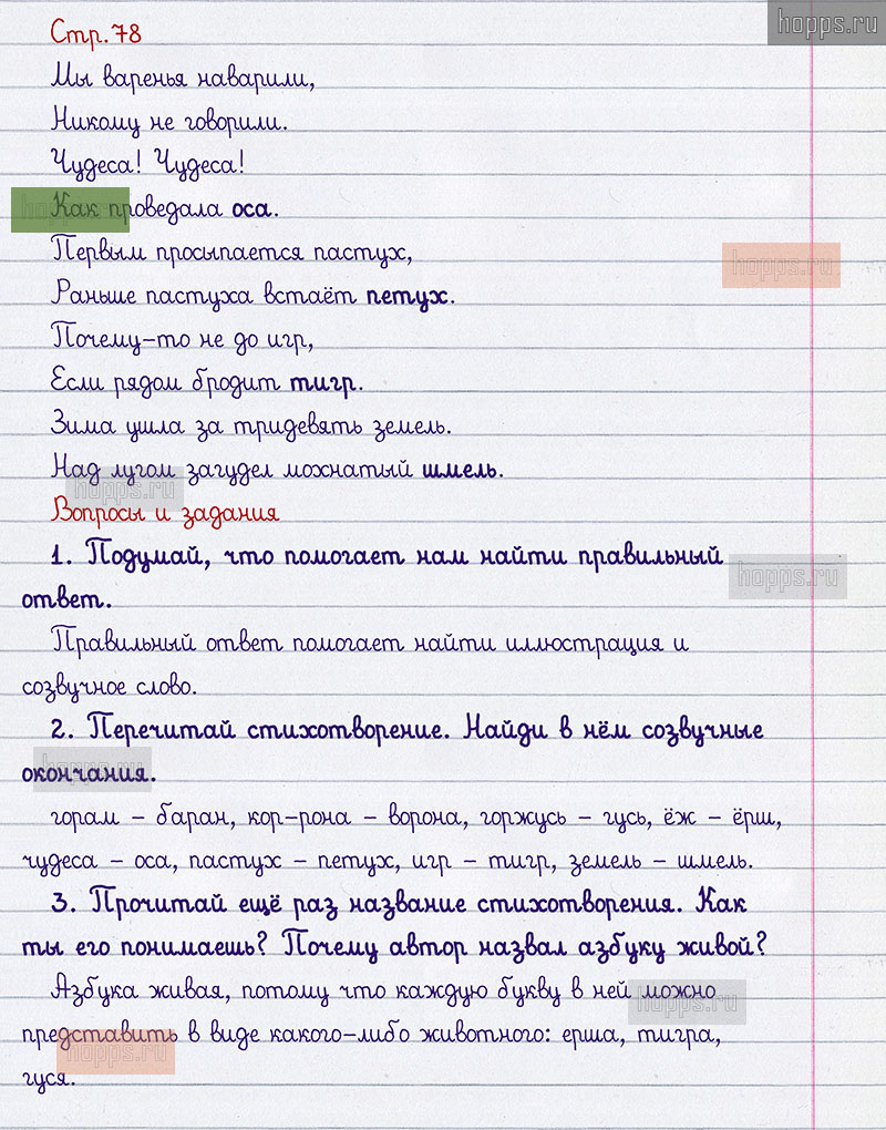 Подробные ответы к вопросам, расположенным на 78 странице 1 части учебника 2011 года по литературному чтению авторов Л.Ф. Климанова, В.Г. Горецкий, Л.А. Виноградская для учащихся 1 класса.