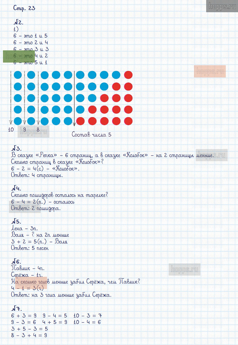 Подробные ответы к заданиям, расположенным на 23 странице 2 части рабочей тетради по математике авторов М.И. Моро, С.И. Волкова для учащихся 1 класса.