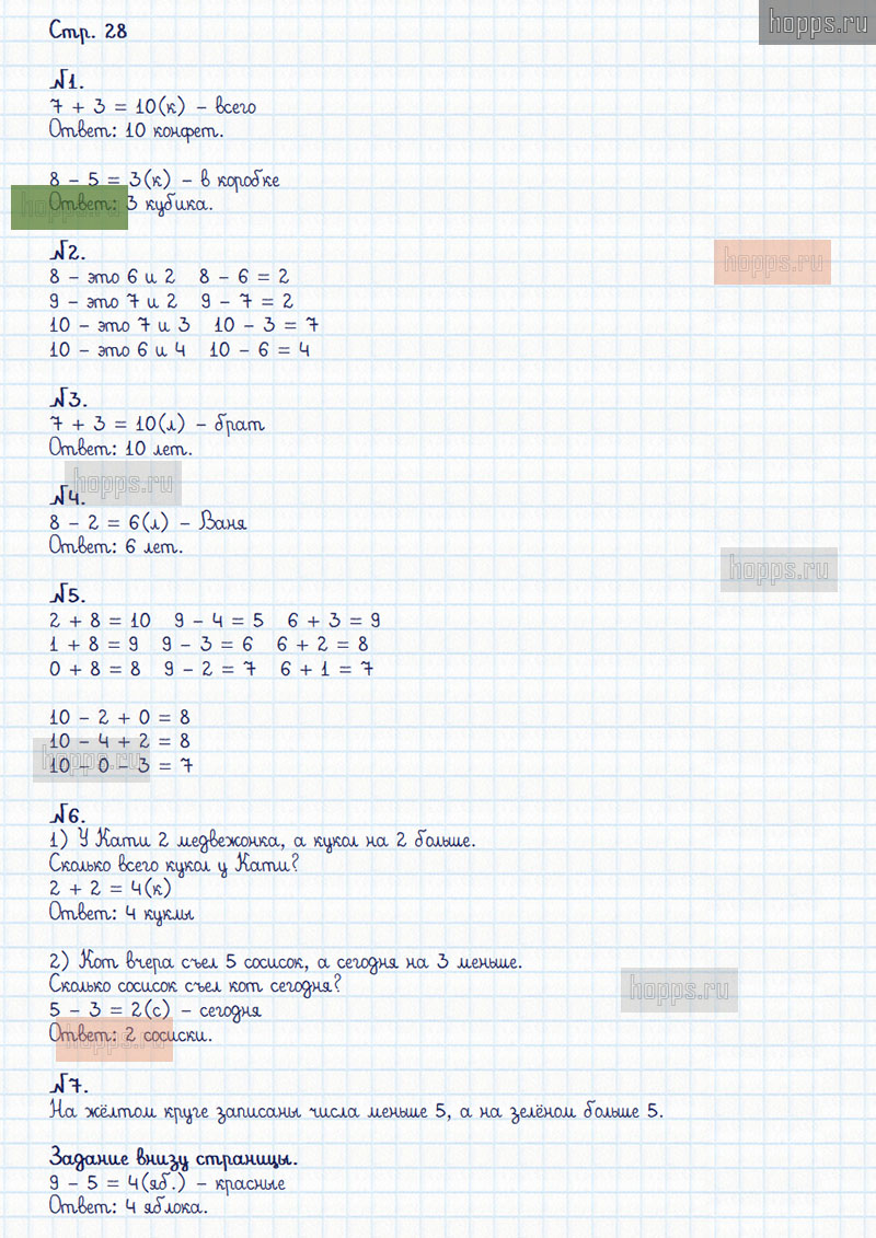 Подробные ответы к заданиям, расположенным на 28 странице 2 части рабочей тетради по математике авторов М.И. Моро, С.И. Волкова для учащихся 1 класса.