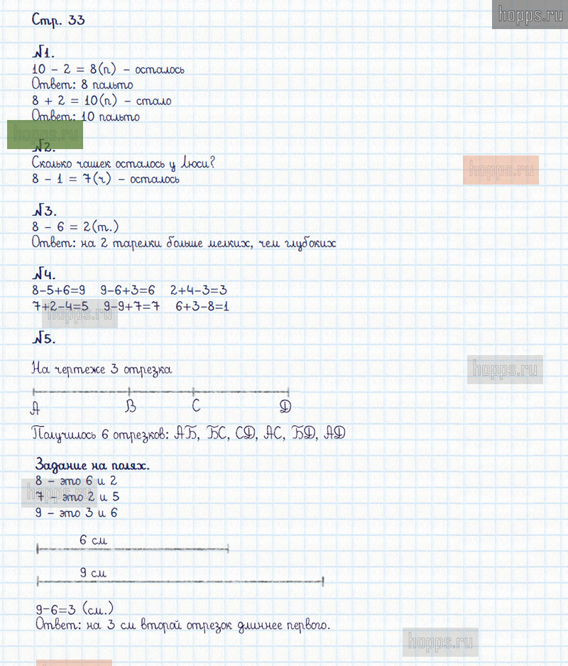 Подробные ответы к заданиям, расположенным на 33 странице 2 части рабочей тетради по математике авторов М.И. Моро, С.И. Волкова для учащихся 1 класса.