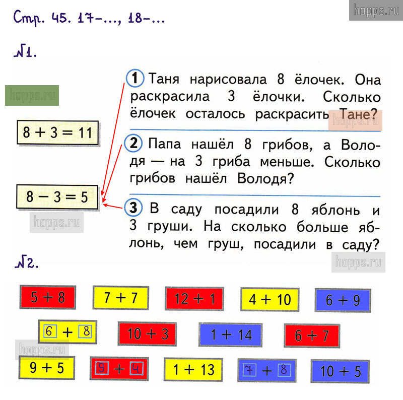 Подробные ответы к заданиям, расположенным на 45 странице 2 части рабочей тетради по математике авторов М.И. Моро, С.И. Волкова для учащихся 1 класса.