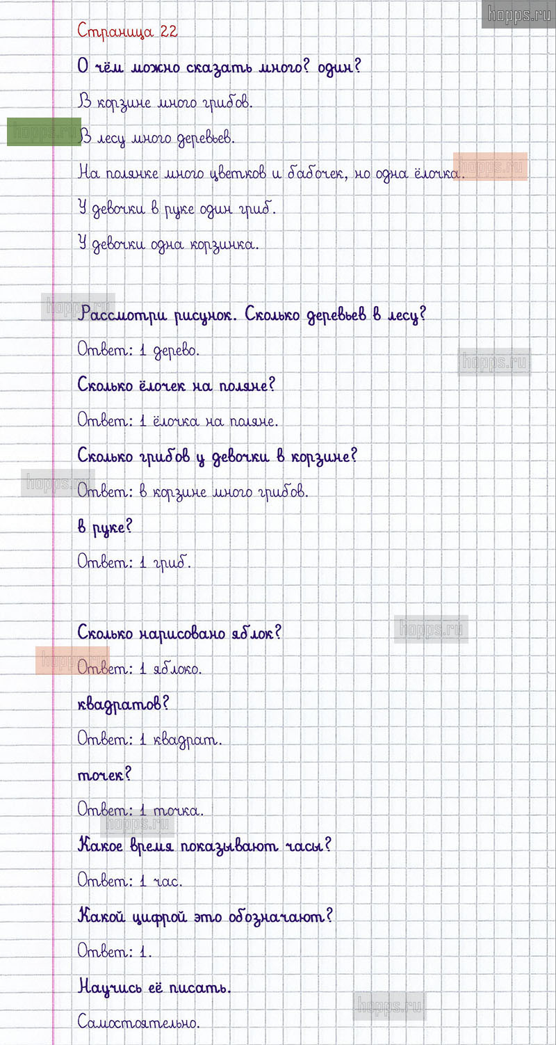 Подробные ответы к заданиям, расположенным на 22 странице 1 части учебника по математике авторов М.И. Моро, С.И. Волкова, С.В. Степанова для учащихся 1 класса.