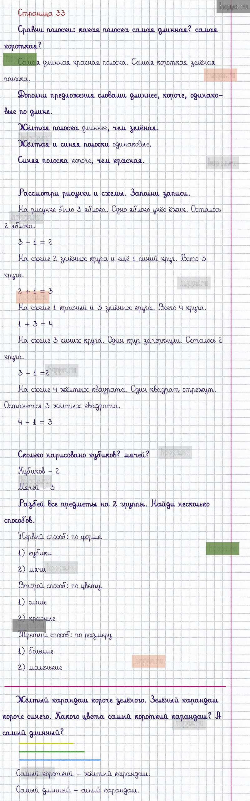 Подробные ответы к заданиям, расположенным на 33 странице 1 части учебника по математике авторов М.И. Моро, С.И. Волкова, С.В. Степанова для учащихся 1 класса.