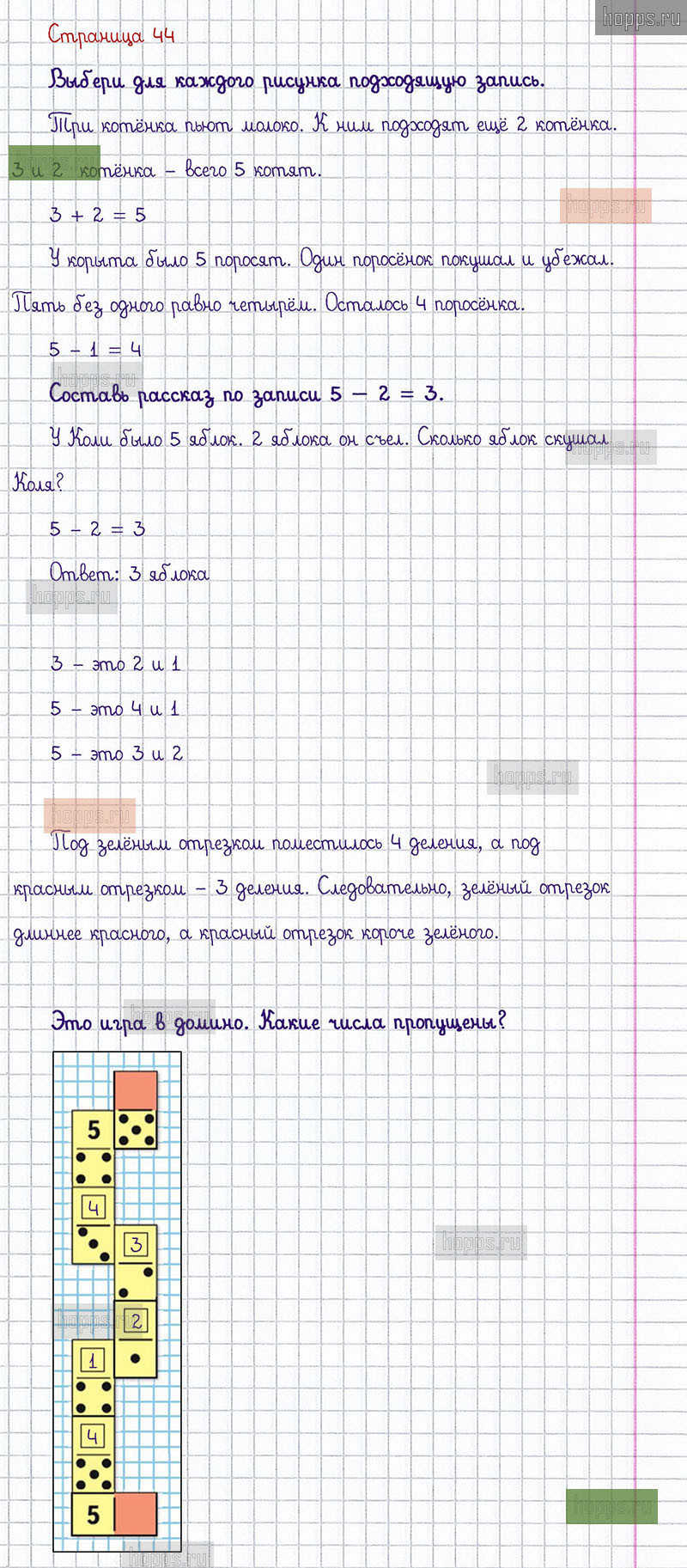 Подробные ответы к заданиям, расположенным на 44 странице 1 части учебника по математике авторов М.И. Моро, С.И. Волкова, С.В. Степанова для учащихся 1 класса.
