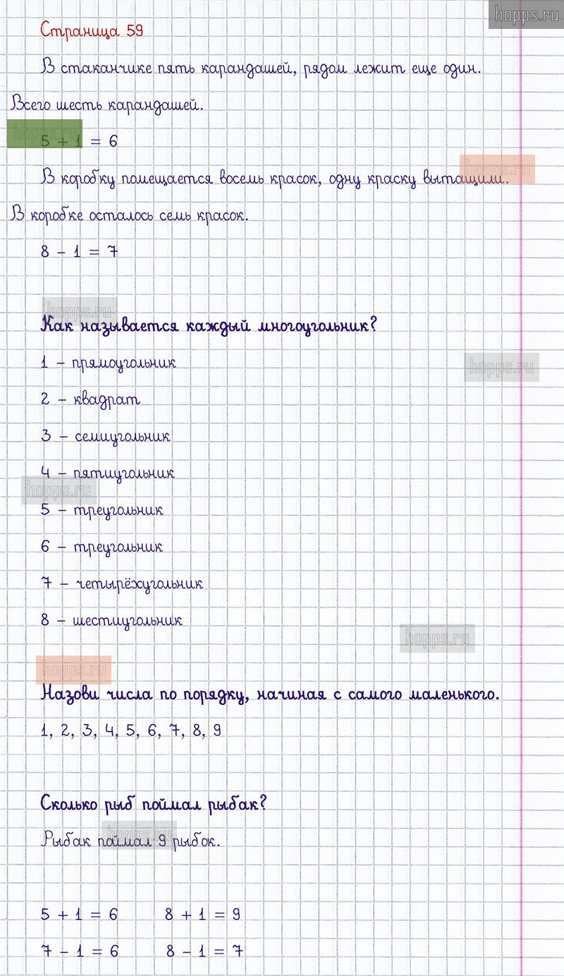 Подробные ответы к заданиям, расположенным на 59 странице 1 части учебника по математике авторов М.И. Моро, С.И. Волкова, С.В. Степанова для учащихся 1 класса.