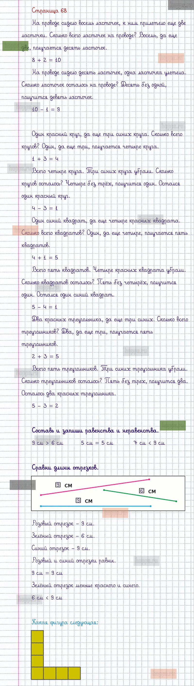 Подробные ответы к заданиям, расположенным на 68 странице 1 части учебника по математике авторов М.И. Моро, С.И. Волкова, С.В. Степанова для учащихся 1 класса.