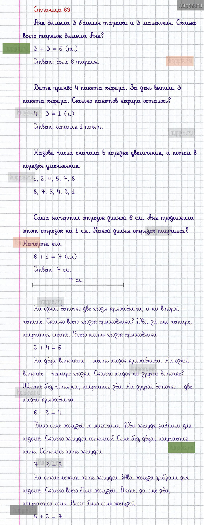 Подробные ответы к заданиям, расположенным на 69 странице 1 части учебника по математике авторов М.И. Моро, С.И. Волкова, С.В. Степанова для учащихся 1 класса.