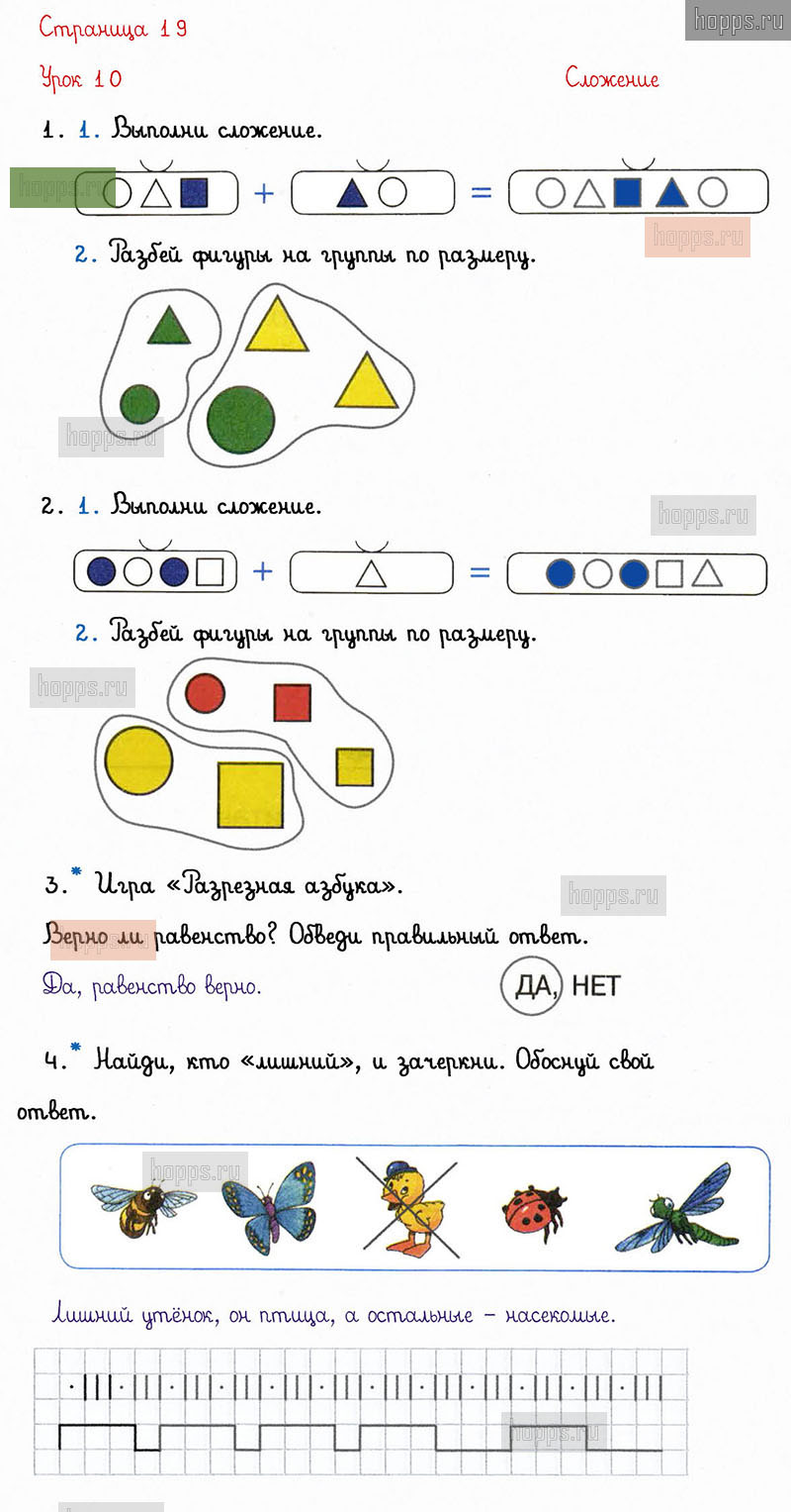 Подробные ответы к заданиям на 19 странице 1 части рабочей тетради по математике автора Л. Г. Петерсон для учащихся 1 класса. Урок 10. Сложение.