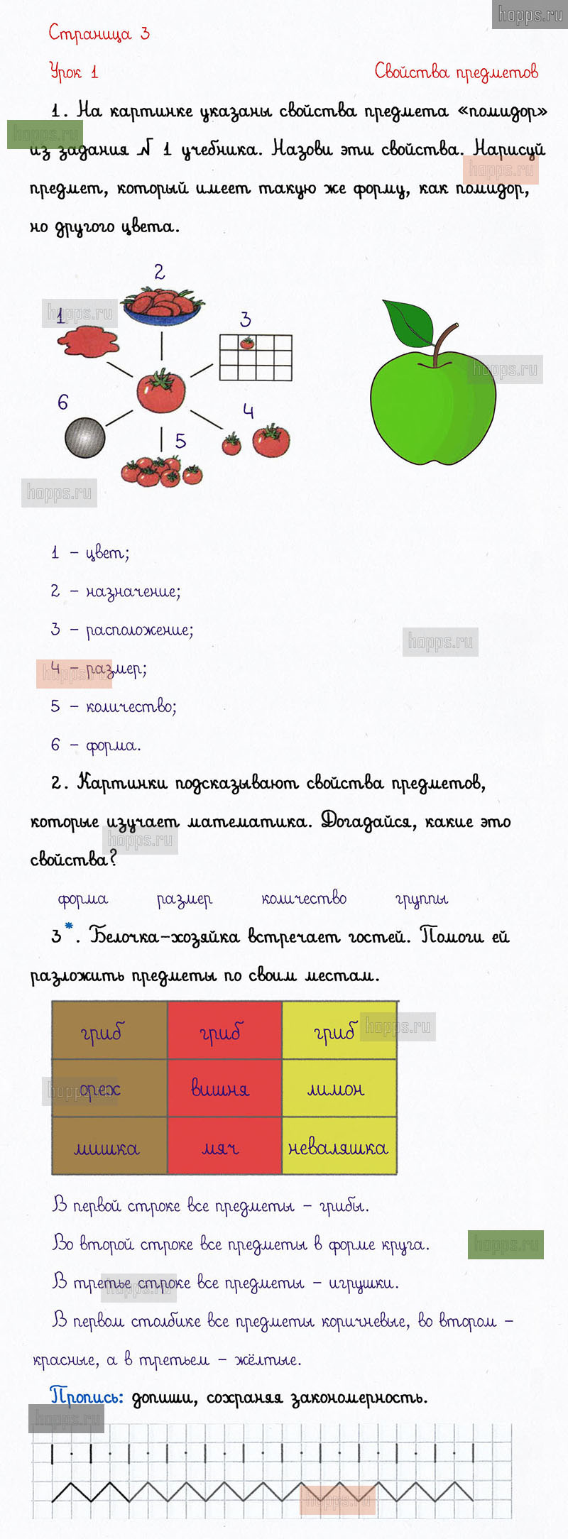 Подробные ответы к заданиям на 3 странице 1 части рабочей тетради по математике автора Л. Г. Петерсон для учащихся 1 класса. Урок 1. Свойства предметов.