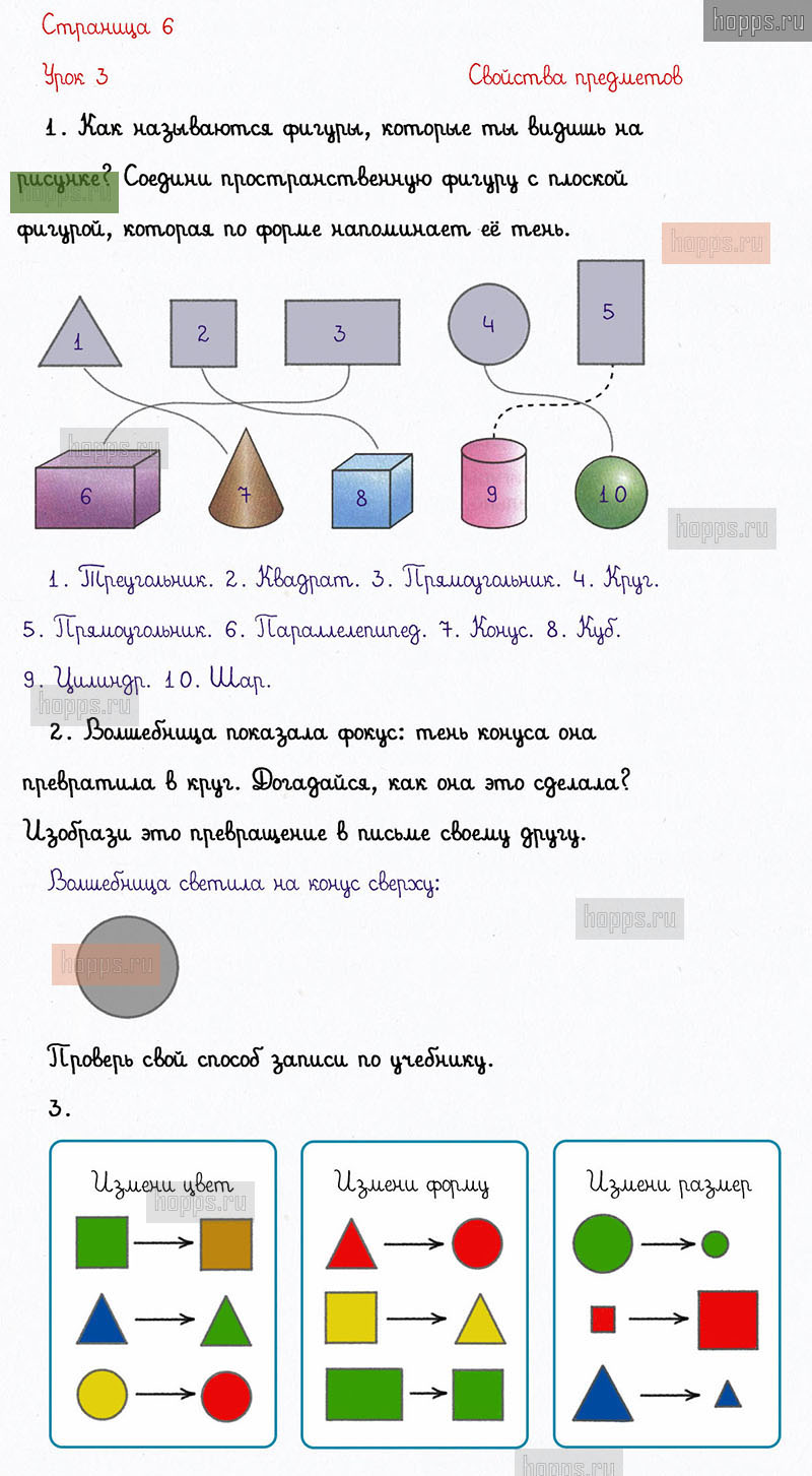 Подробные ответы к заданиям на 6 странице 1 части рабочей тетради по математике автора Л. Г. Петерсон для учащихся 1 класса. Урок 3. Свойства предметов.