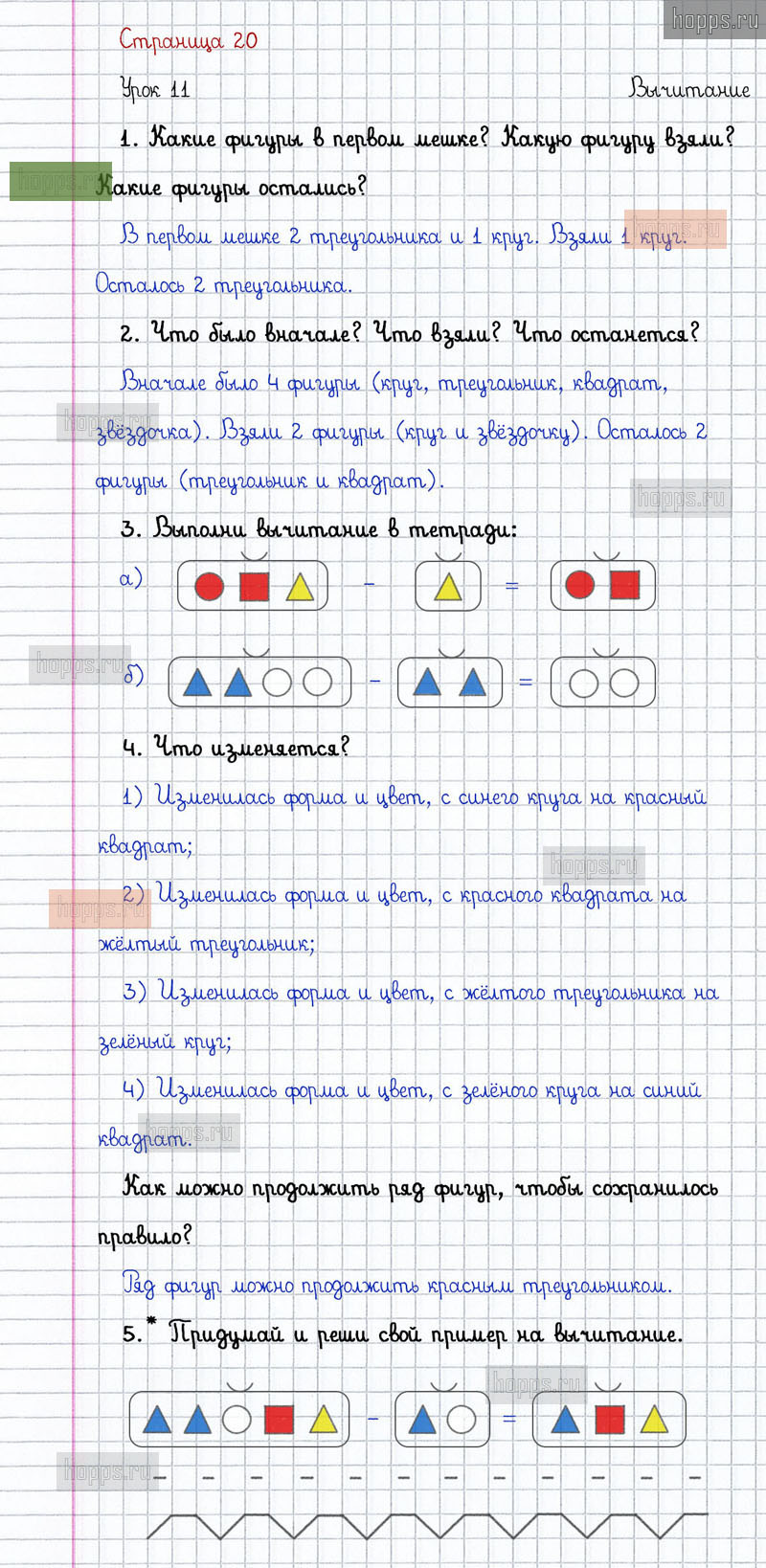 Подробные ответы к заданиям на 20 странице 1 части учебника по математике автора Л.Г. Петерсон для учащихся 1 класса. Урок 11. Вычитание.