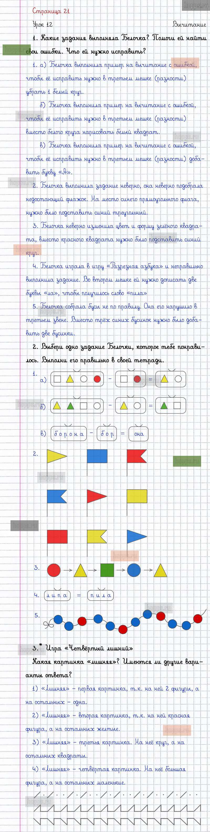 Подробные ответы к заданиям на 21 странице 1 части учебника по математике автора Л.Г. Петерсон для учащихся 1 класса. Урок 12. Вычитание.