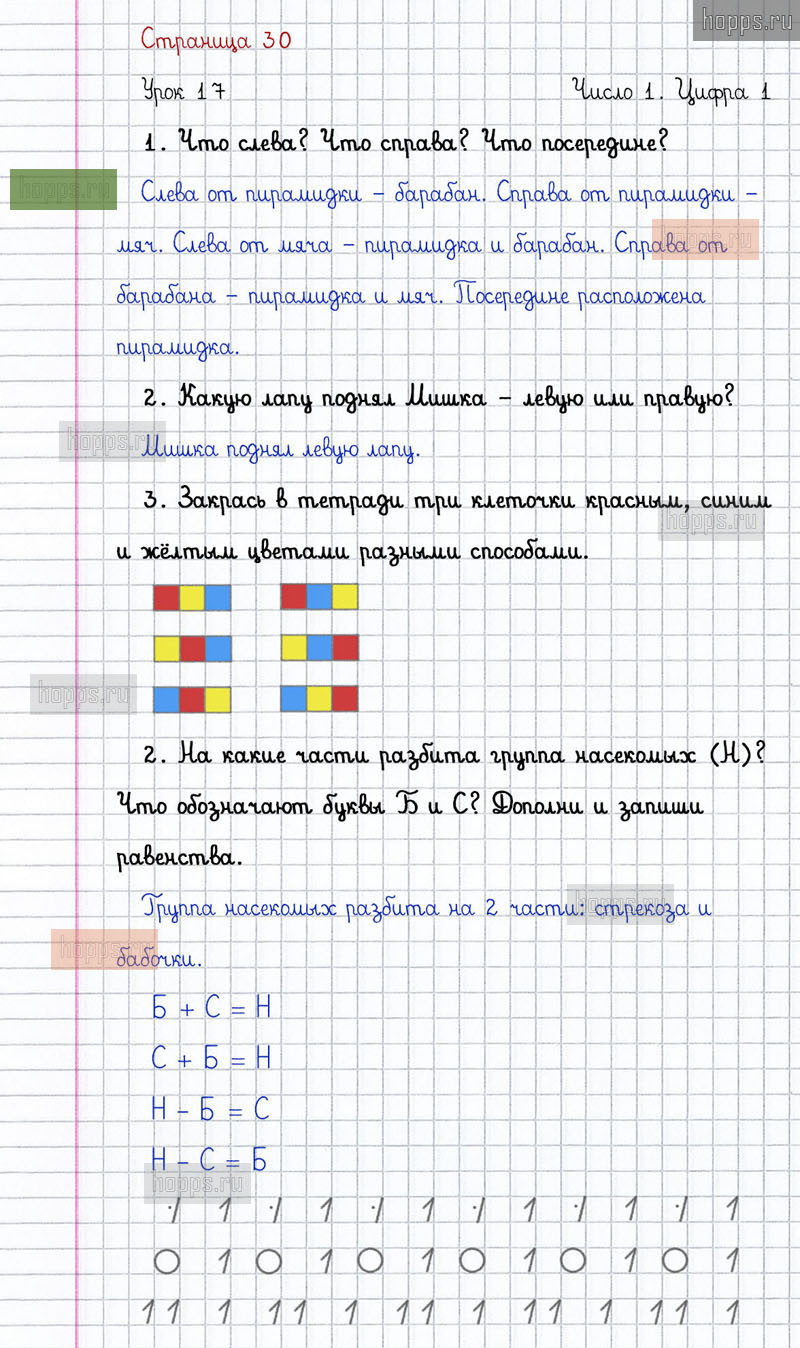 Подробные ответы к заданиям на 30 странице 1 части учебника по математике автора Л.Г. Петерсон для учащихся 1 класса. Урок 17. Число 1. Цифра 1.