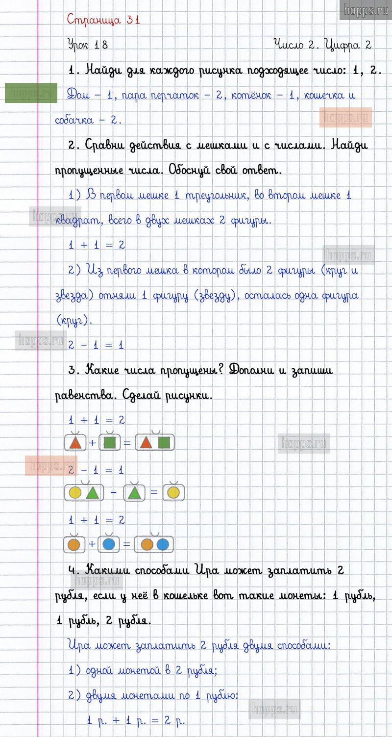 Подробные ответы к заданиям на 31 странице 1 части учебника по математике автора Л.Г. Петерсон для учащихся 1 класса. Урок 18. Число 2. Цифра 2.