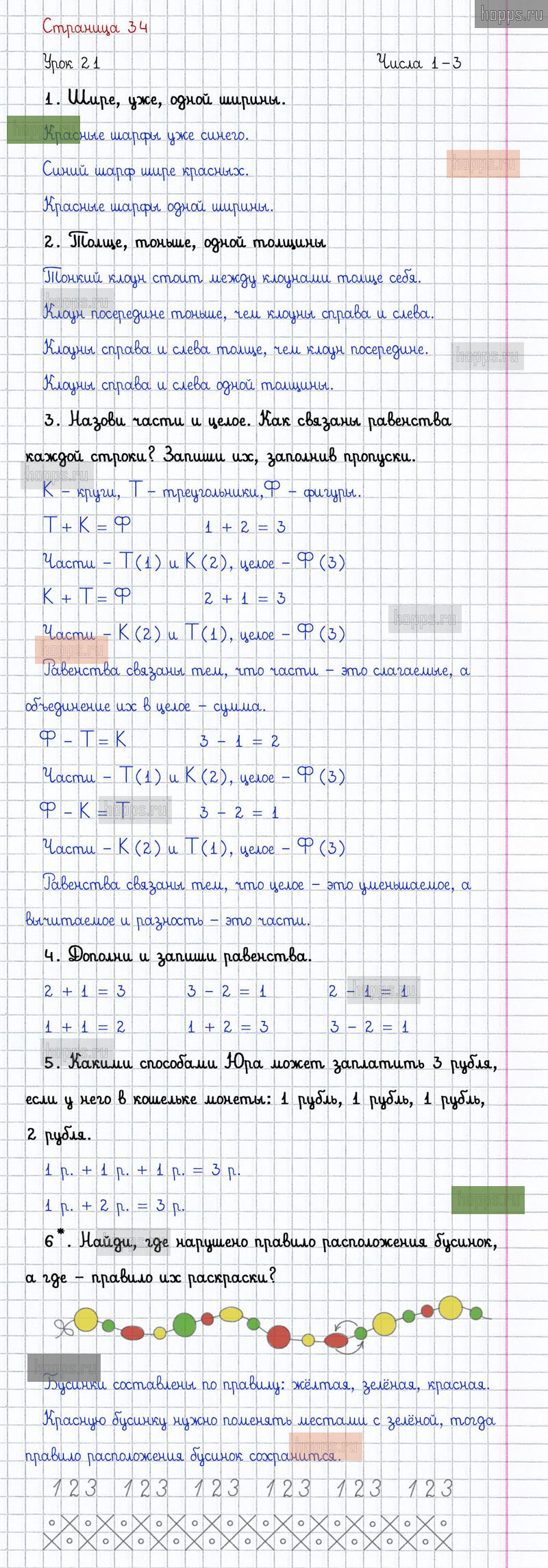 Подробные ответы к заданиям на 34 странице 1 части учебника по математике автора Л.Г. Петерсон для учащихся 1 класса. Урок 21. Числа 1-3.