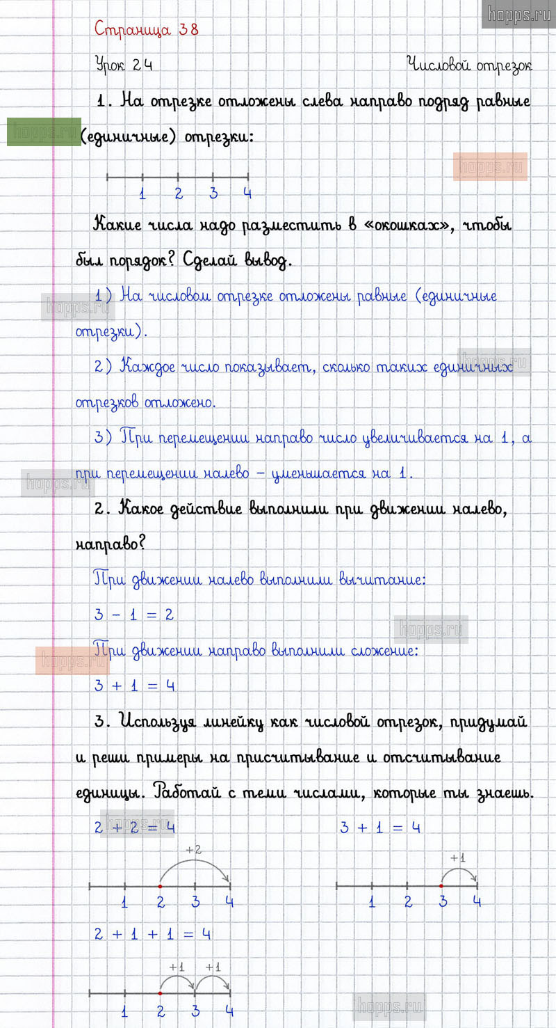 Подробные ответы к заданиям на 38 странице 1 части учебника по математике автора Л.Г. Петерсон для учащихся 1 класса. Урок 24. Числовой отрезок.
