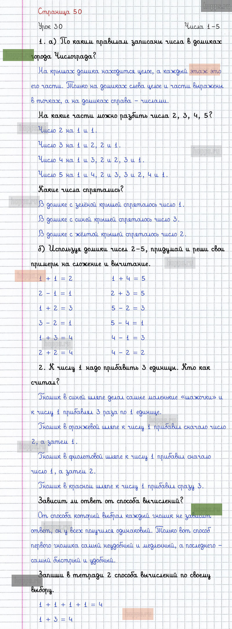 Подробные ответы к заданиям на 50 странице 1 части учебника по математике автора Л.Г. Петерсон для учащихся 1 класса. Урок 30. Числа 1 - 5.