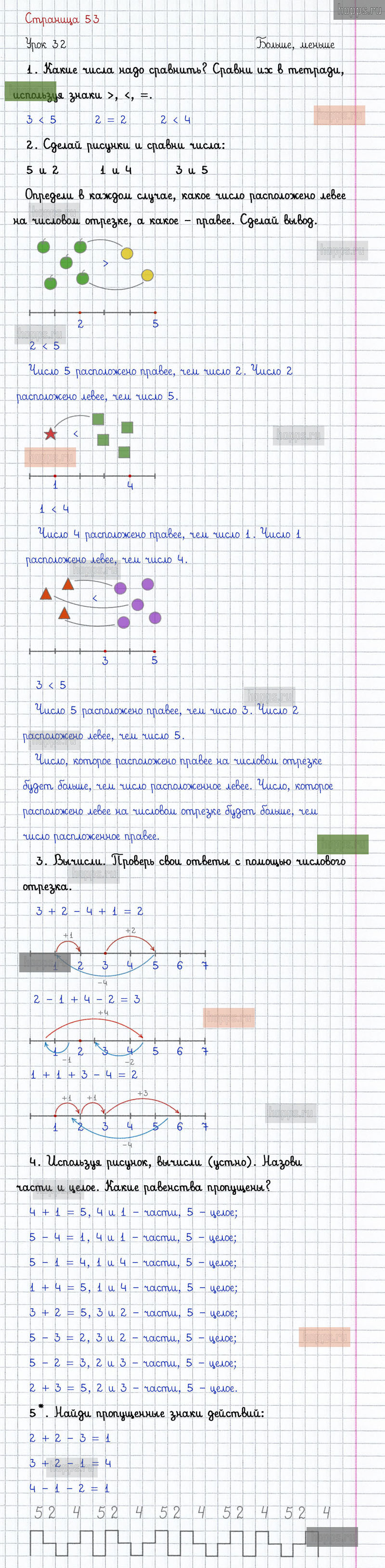 Подробные ответы к заданиям на 53 странице 1 части учебника по математике автора Л.Г. Петерсон для учащихся 1 класса. Урок 32. Больше, меньше.