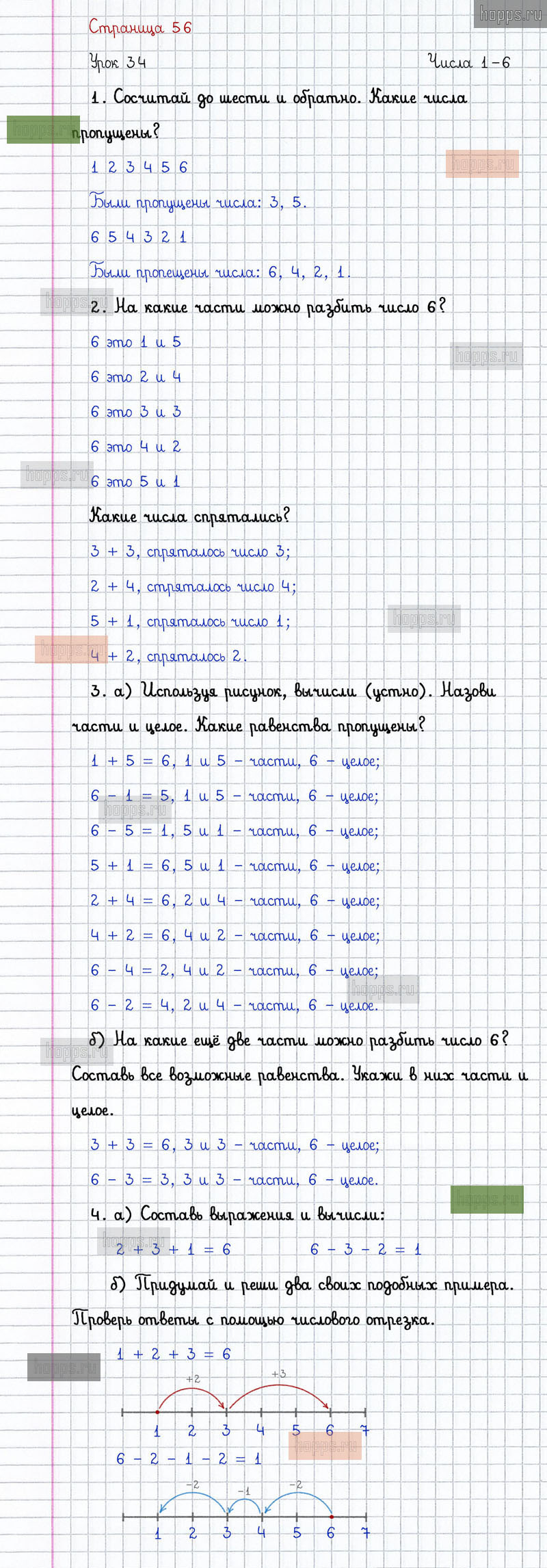 Подробные ответы к заданиям на 56 странице 1 части учебника по математике автора Л.Г. Петерсон для учащихся 1 класса. Урок 34. Числа 1 - 6.