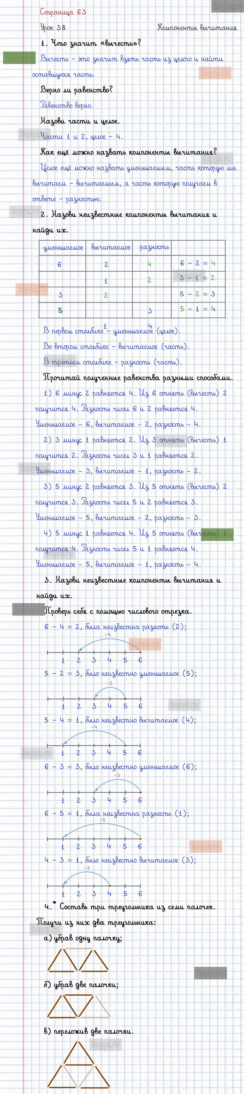 Подробные ответы к заданиям на 63 странице 1 части учебника по математике автора Л.Г. Петерсон для учащихся 1 класса. Урок 38. Компоненты вычитания.