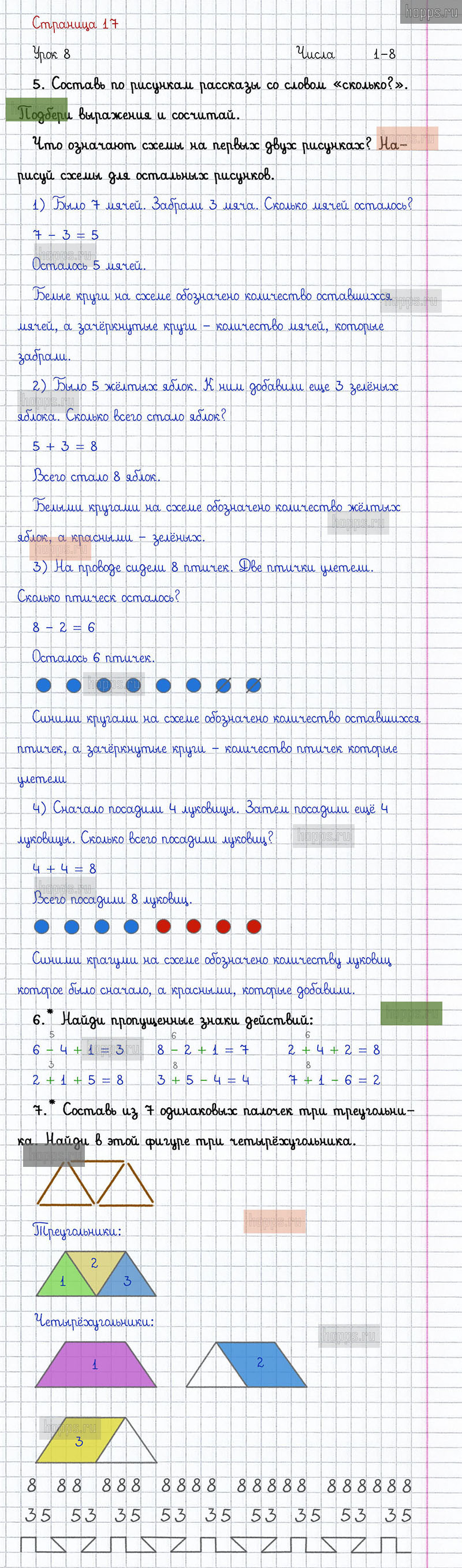 Подробные ответы к заданиям на 17 странице 2 части учебника по математике автора Л.Г. Петерсон для учащихся 1 класса. Урок 8. Числа 1 - 8.