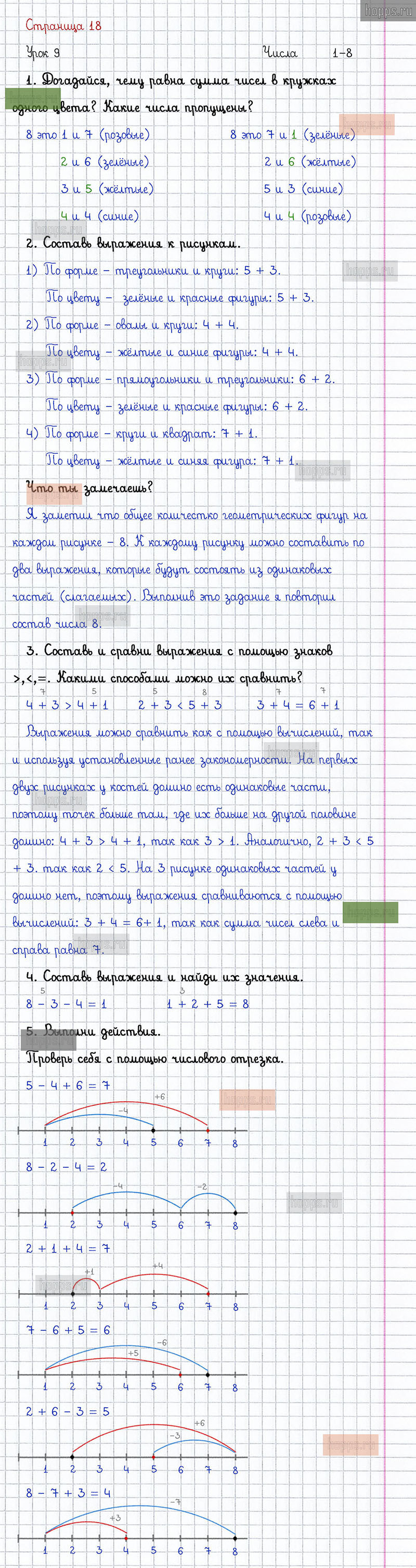 Подробные ответы к заданиям на 18 странице 2 части учебника по математике автора Л.Г. Петерсон для учащихся 1 класса. Урок 9. Числа 1 - 8.