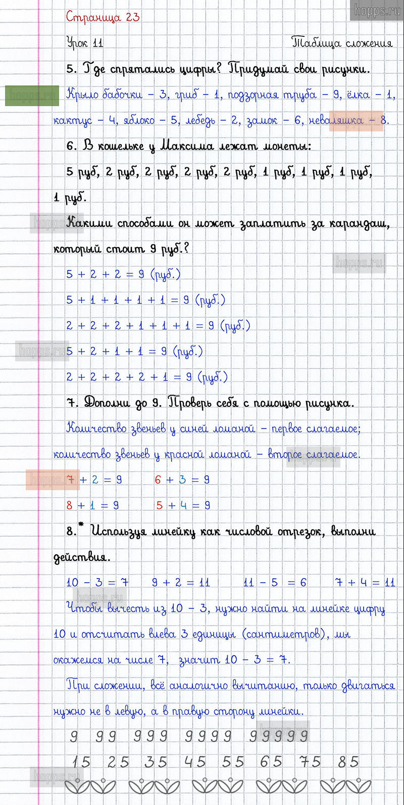 Подробные ответы к заданиям на 23 странице 2 части учебника по математике автора Л.Г. Петерсон для учащихся 1 класса. Урок 11. Таблица сложения.