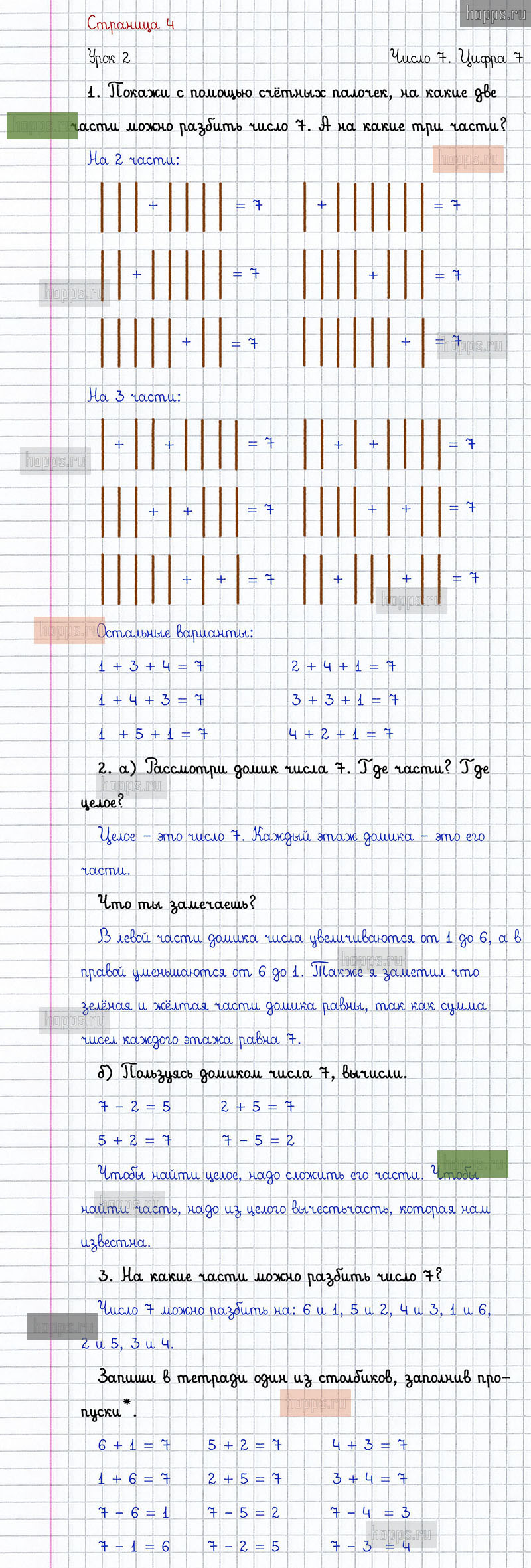 Подробные ответы к заданиям на 4 странице 2 части учебника по математике автора Л.Г. Петерсон для учащихся 1 класса. Урок 2. Число 7. Цифра 7.
