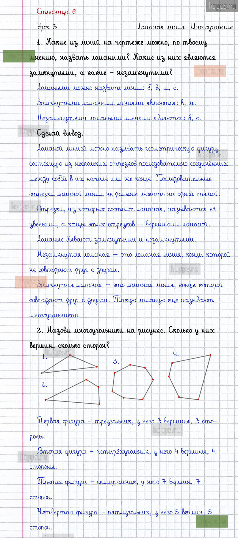 Подробные ответы к заданиям на 6 странице 2 части учебника по математике автора Л.Г. Петерсон для учащихся 1 класса. Урок 3. Ломаная линия. Многоугольник.