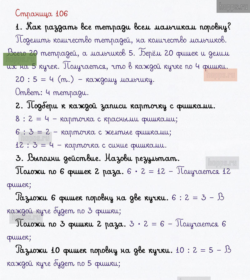 Подробные ответы к заданиям на 106 странице 1 части учебника по математике авторов В. Н. Рудницкая, Е. Э. Кочурова, О. А. Рыдзе для учащихся 1 класса. Урок 47. Делим числа.