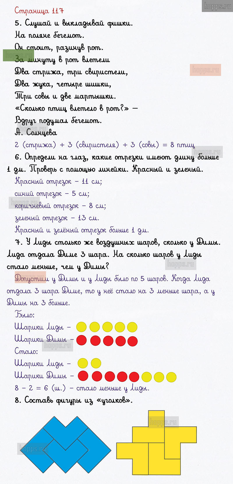 Подробные ответы к заданиям на 117 странице 1 части учебника по математике авторов В. Н. Рудницкая, Е. Э. Кочурова, О. А. Рыдзе для учащихся 1 класса. Урок 52. Складываем и вычитаем числа.