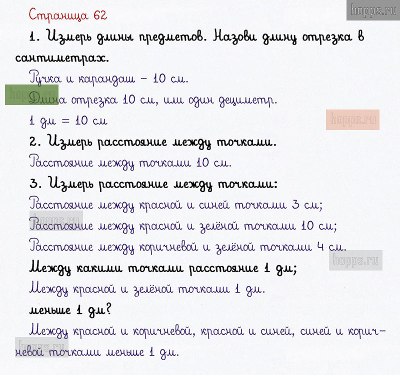 Подробные ответы к заданиям на 62 странице 1 части учебника по математике авторов В. Н. Рудницкая, Е. Э. Кочурова, О. А. Рыдзе для учащихся 1 класса. Урок 26. Измеряем длину в дециметрах.