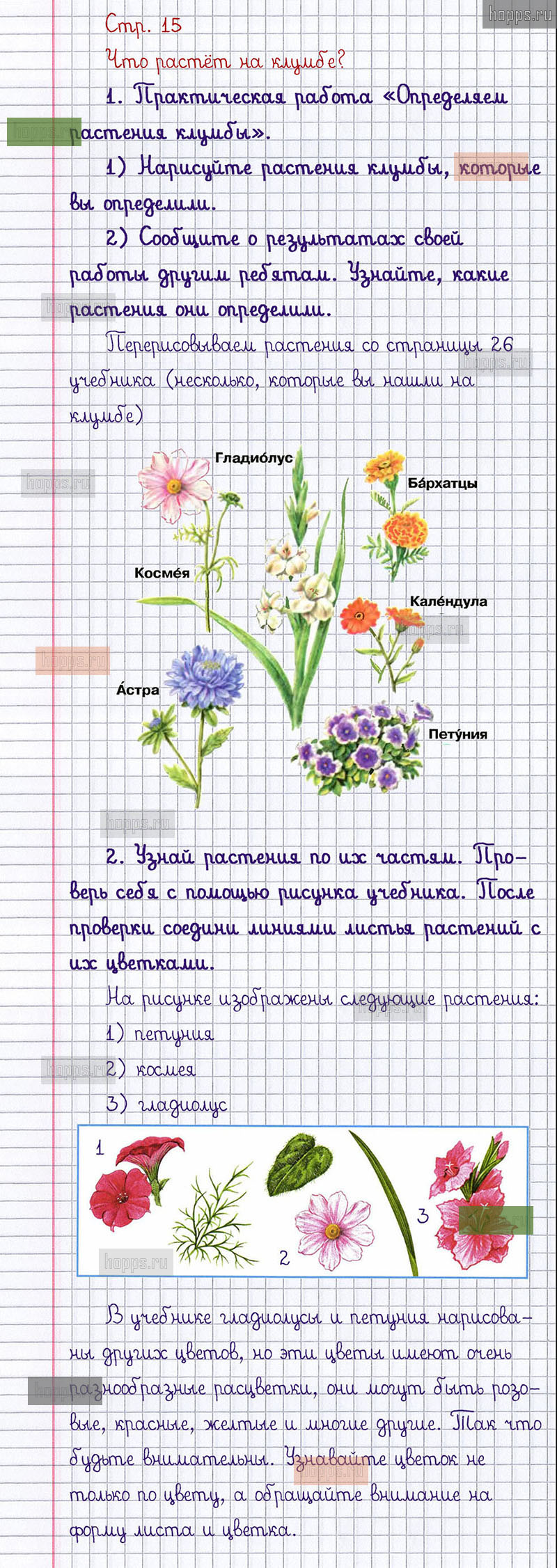 Подробные ответы к заданиям, расположенным на 15 странице 1 части рабочей тетради 2013 года по окружающему миру автора Плешаков А.А. для учащихся 1 класса.