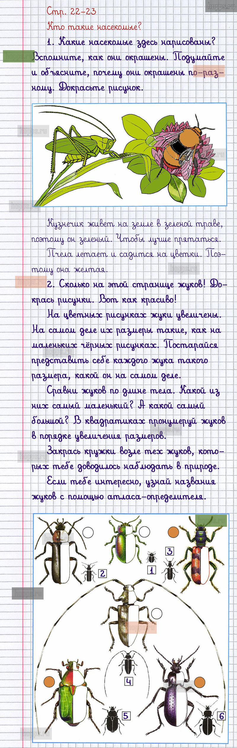 Подробные ответы к заданиям, расположенным на 22-23 странице 1 части рабочей тетради 2013 года по окружающему миру автора Плешаков А.А. для учащихся 1 класса.