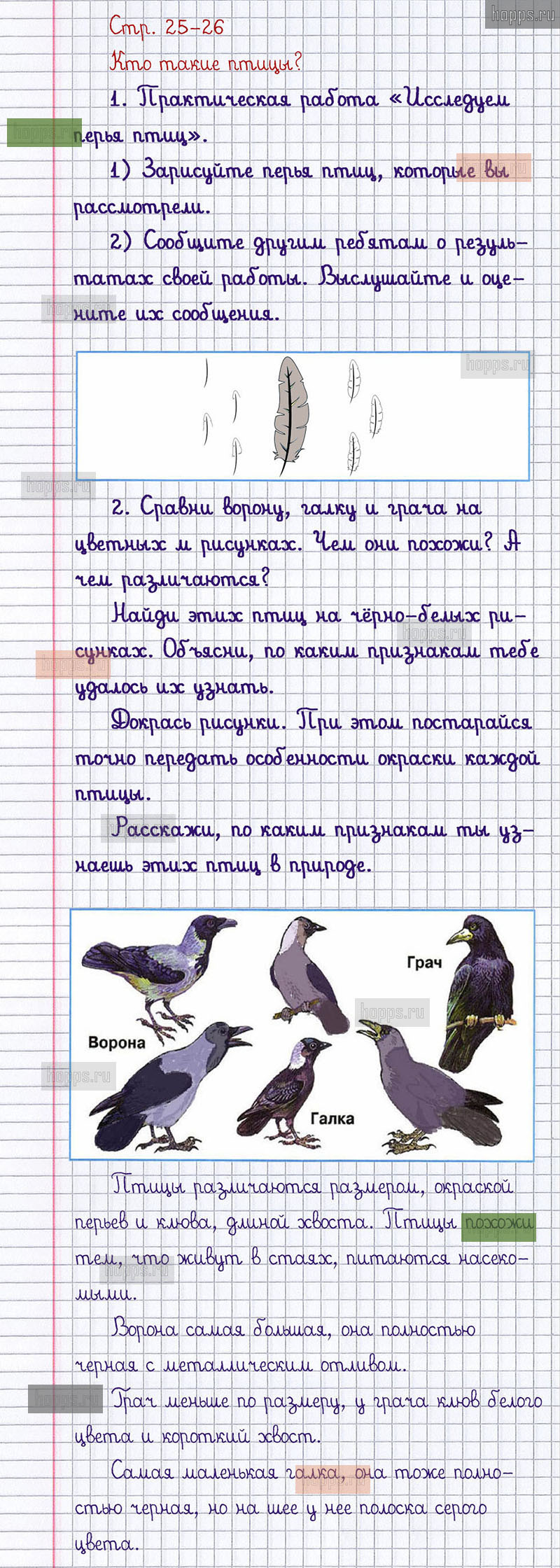Подробные ответы к заданиям, расположенным на 25-26 странице 1 части рабочей тетради 2013 года по окружающему миру автора Плешаков А.А. для учащихся 1 класса.
