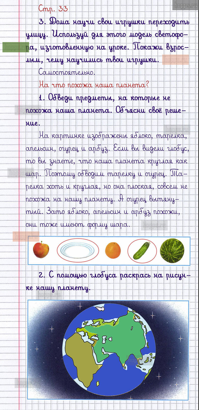 Подробные ответы к заданиям, расположенным на 33 странице 1 части рабочей тетради 2013 года по окружающему миру автора Плешаков А.А. для учащихся 1 класса.
