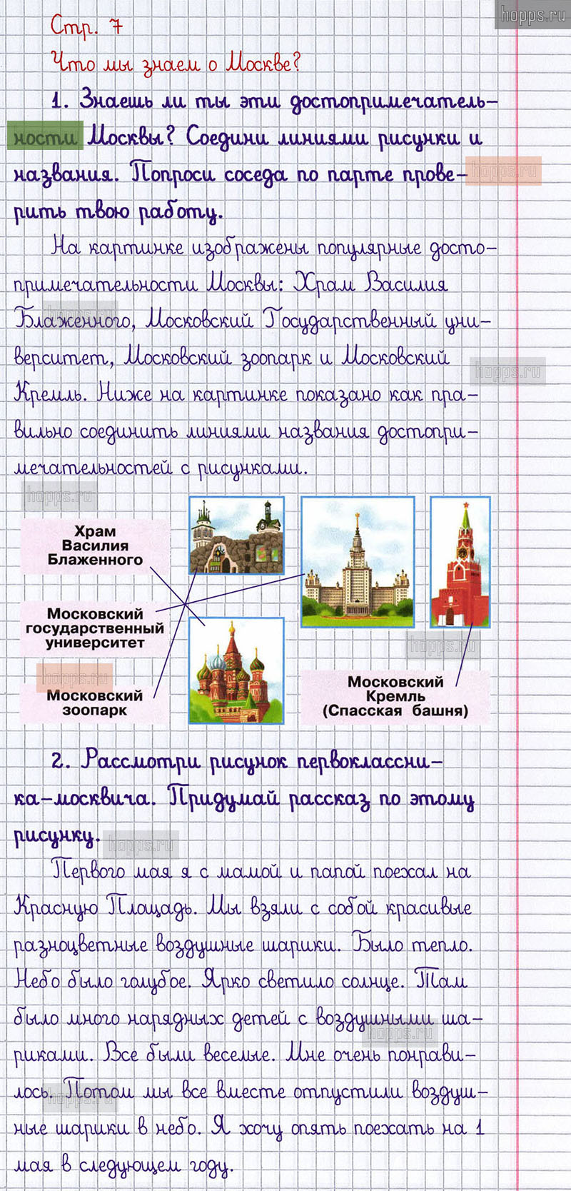 Подробные ответы к заданиям, расположенным на 7 странице 1 части рабочей тетради 2013 года по окружающему миру автора Плешаков А.А. для учащихся 1 класса.
