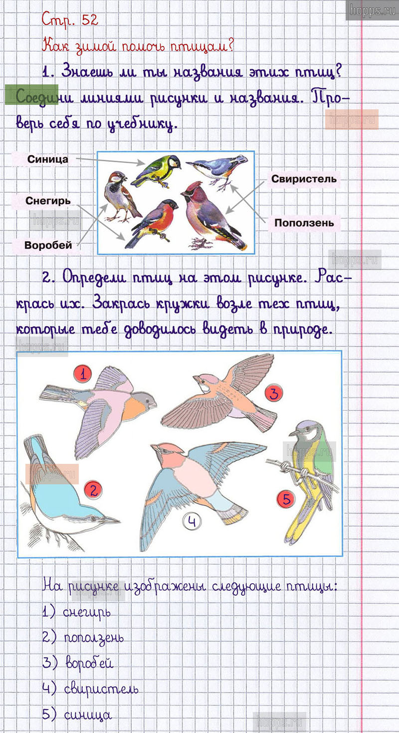Подробные ответы к заданиям, расположенным на 52 странице 1 части рабочей тетради 2019 года по окружающему миру автора Плешаков А.А. для учащихся 1 класса.