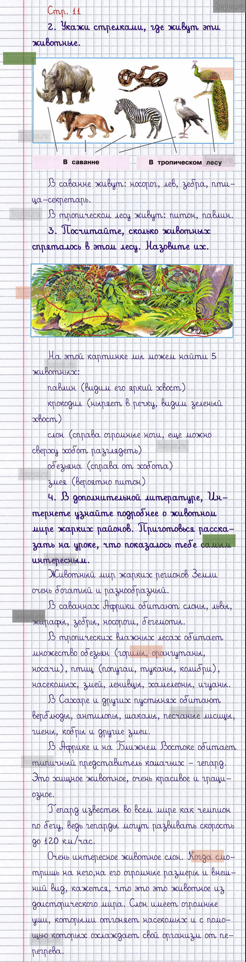 Подробные ответы к заданиям, расположенным на 11 странице 2 части рабочей тетради 2019 года по окружающему миру автора Плешаков А.А. для учащихся 1 класса.