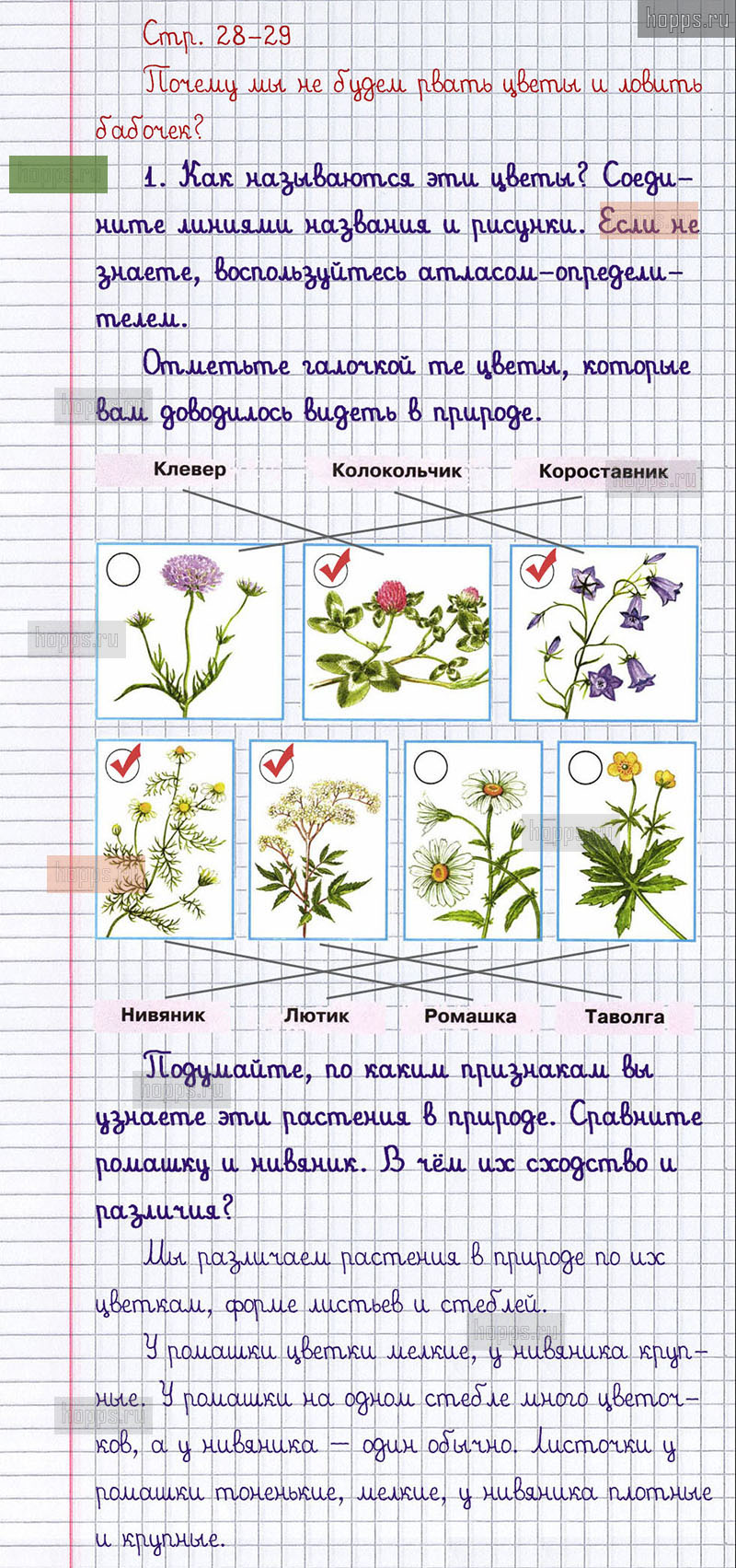Подробные ответы к заданиям, расположенным на 28-29 странице 2 части рабочей тетради 2019 года по окружающему миру автора Плешаков А.А. для учащихся 1 класса.