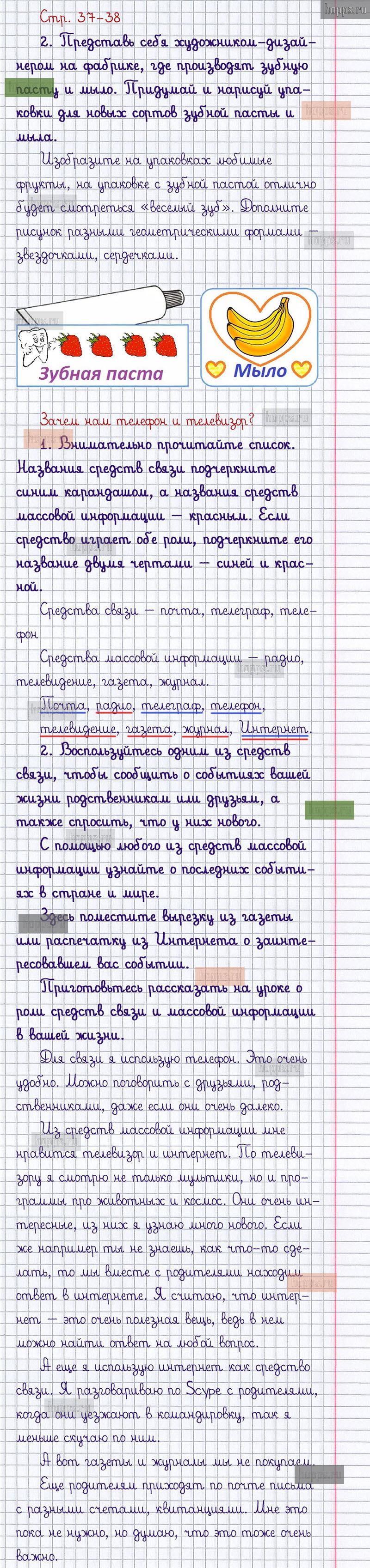 Подробные ответы к заданиям, расположенным на 37-38 странице 2 части рабочей тетради 2019 года по окружающему миру автора Плешаков А.А. для учащихся 1 класса.