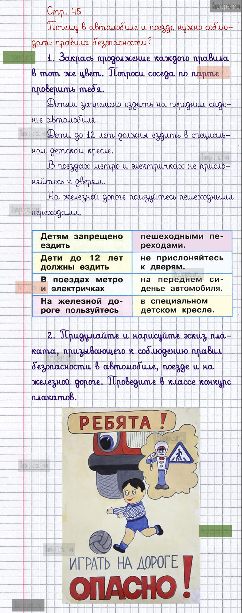 Подробные ответы к заданиям, расположенным на 45 странице 2 части рабочей тетради 2019 года по окружающему миру автора Плешаков А.А. для учащихся 1 класса.